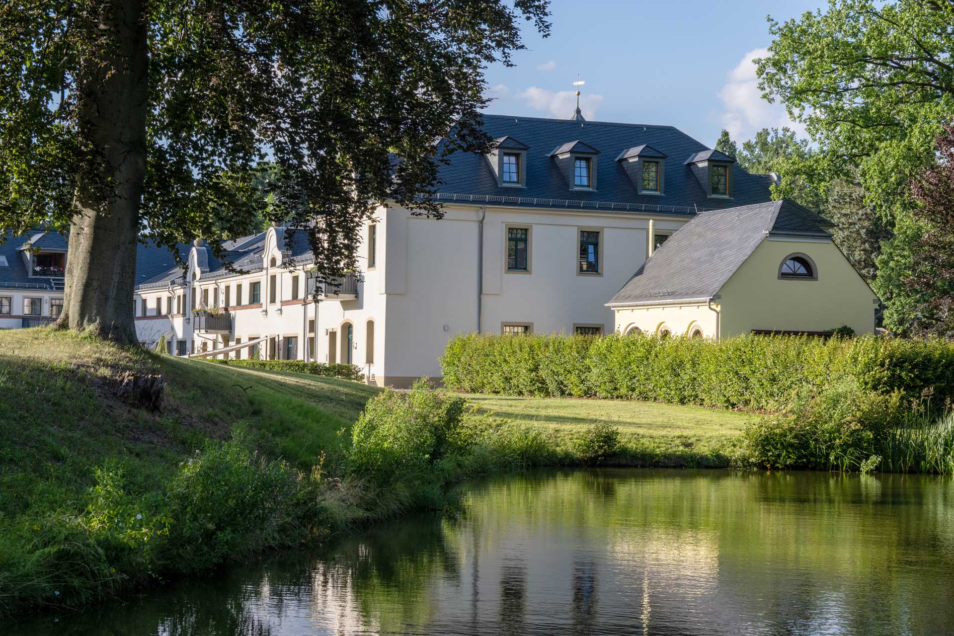 Das Rittergut Großharthau gehört mit einer Grundstücksgröße von ca. 19.713 m² zu den größten Gütern der Region. Die Gesamtanlage mit ihrem ca. 3.000 m² großen Innenhof und den dazugehörigen Teichen hat Schlosscharakter. Hochwertige Sanierung mit Fertigparkett und hellen Fliesen.